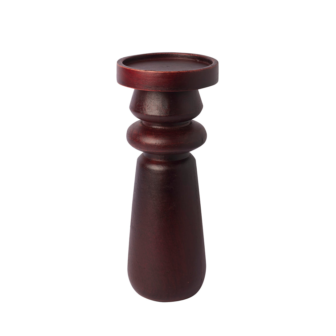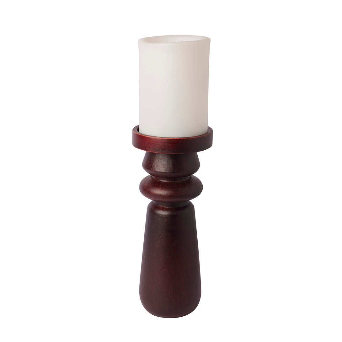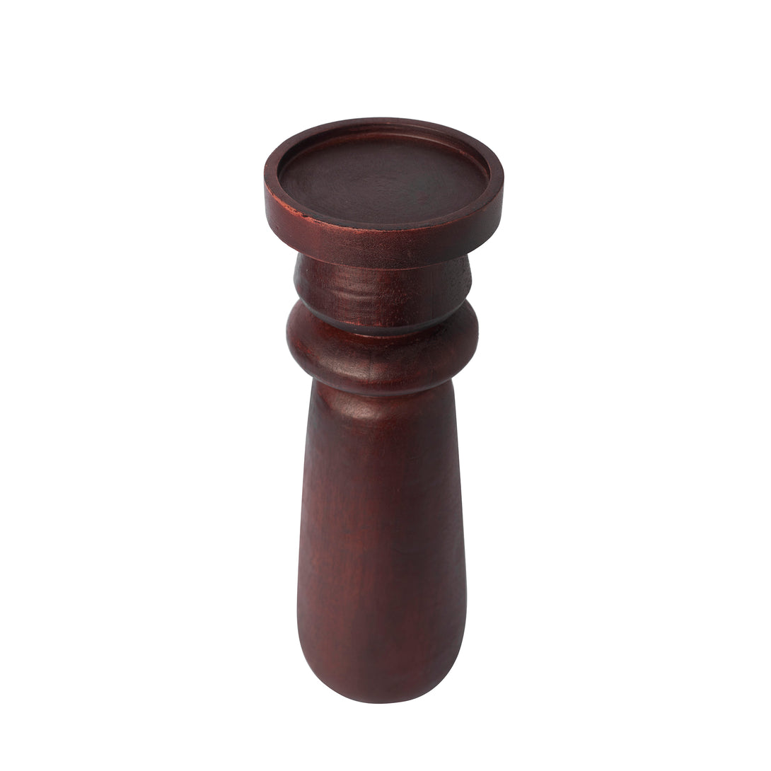 Crafted from rich, deep-toned wood, these holders feature a classic, turned silhouette that exudes a sense of timeless heritage. The hand-finished wood grain boasts a lustrous, warm mahogany hue, creating a beautiful contrast with the crisp white of your favorite pillar candles.