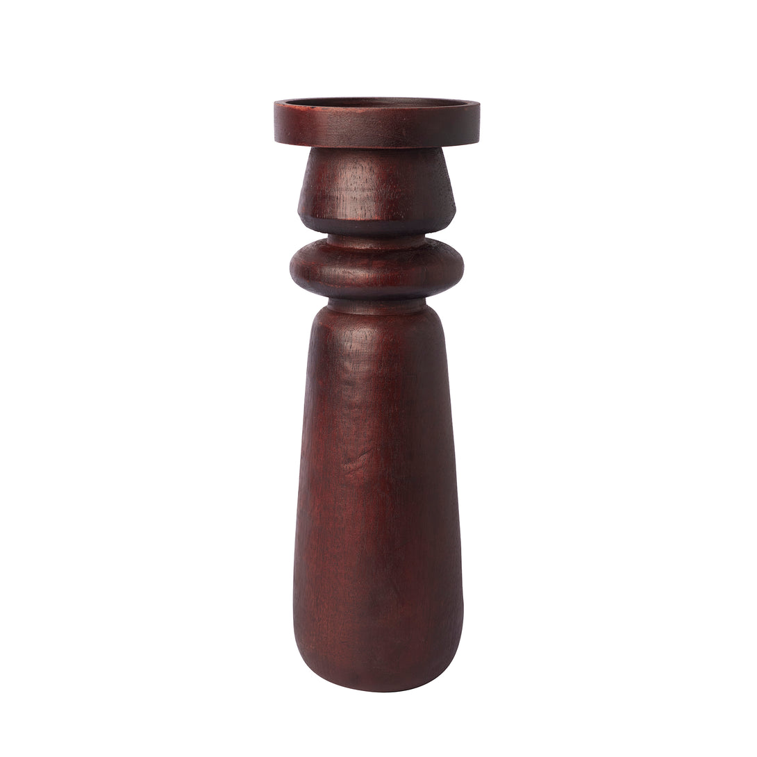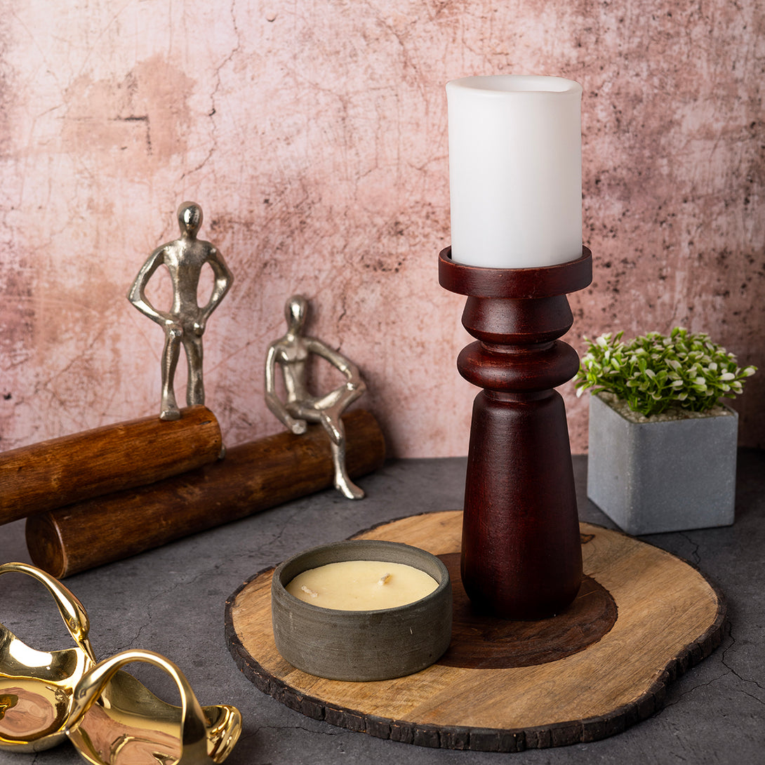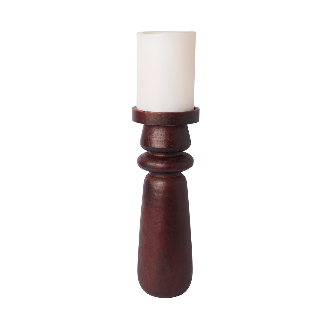 Crafted from rich, deep-toned wood, these holders feature a classic, turned silhouette that exudes a sense of timeless heritage. The hand-finished wood grain boasts a lustrous, warm mahogany hue, creating a beautiful contrast with the crisp white of your favorite pillar candles.