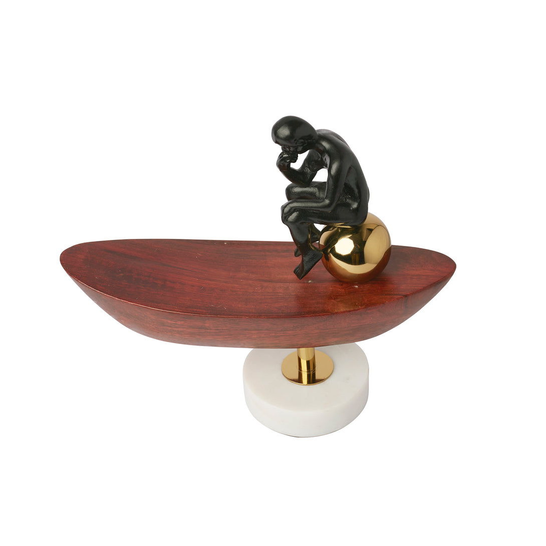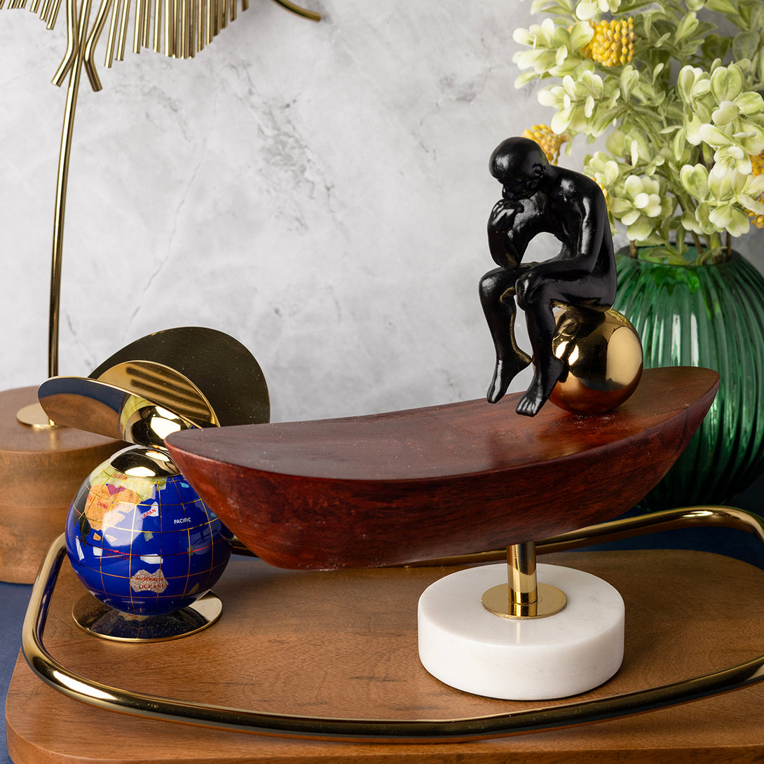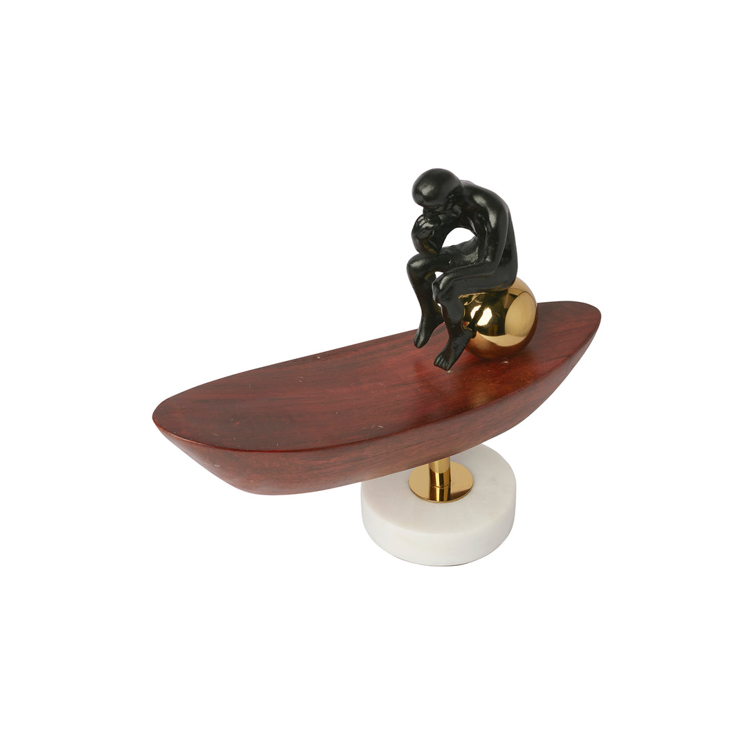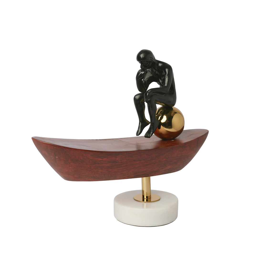invite introspection and elegance into your space with The Voyage of Thought, a striking abstract sculpture that blends classic pondering with modern design.This unique piece features a deep, rich wooden boat hull, symbolizing the journey of life, balanced atop a sleek, white marble base accented with polished gold-tone metal. Perched thoughtfully within the boat is a minimalist, black-finished figure in the classic "thinker" pose, seated upon a brilliant golden sphere.